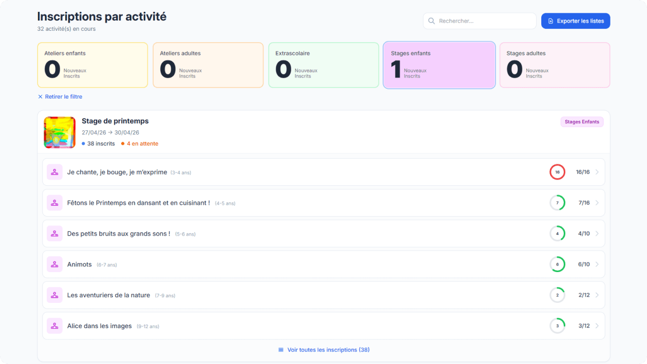 Visualisez le taux de remplissage de chaque atelier et stage en un coup d'œil. Filtrez par catégorie, suivez les jauges et identifiez les activités complètes.