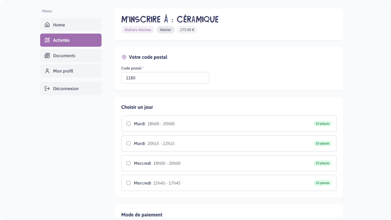 Vos publics s'inscrivent directement depuis votre site web. Choix de l'activité, sélection du créneau et paiement en quelques clics, sans quitter votre site.