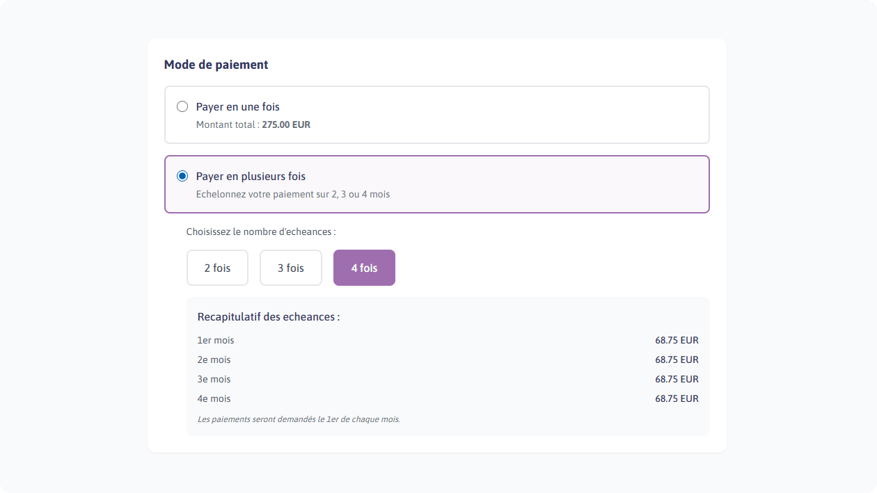 Offrez à vos inscrits la possibilité d'échelonner leur paiement sur 2, 3 ou 4 mois. Le récapitulatif des échéances est affiché clairement avant validation.