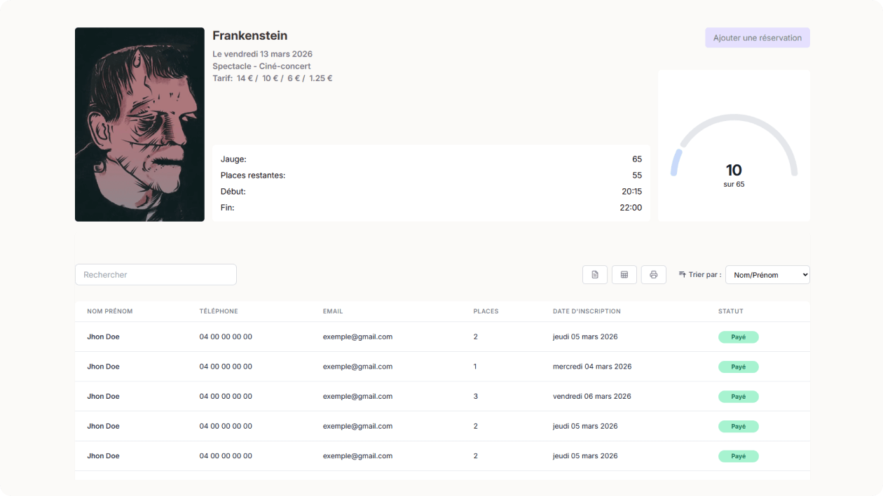Suivez et gérez toutes vos réservations depuis un seul endroit : confirmations, annulations et listes de participants. Exportez vos données en un clic.