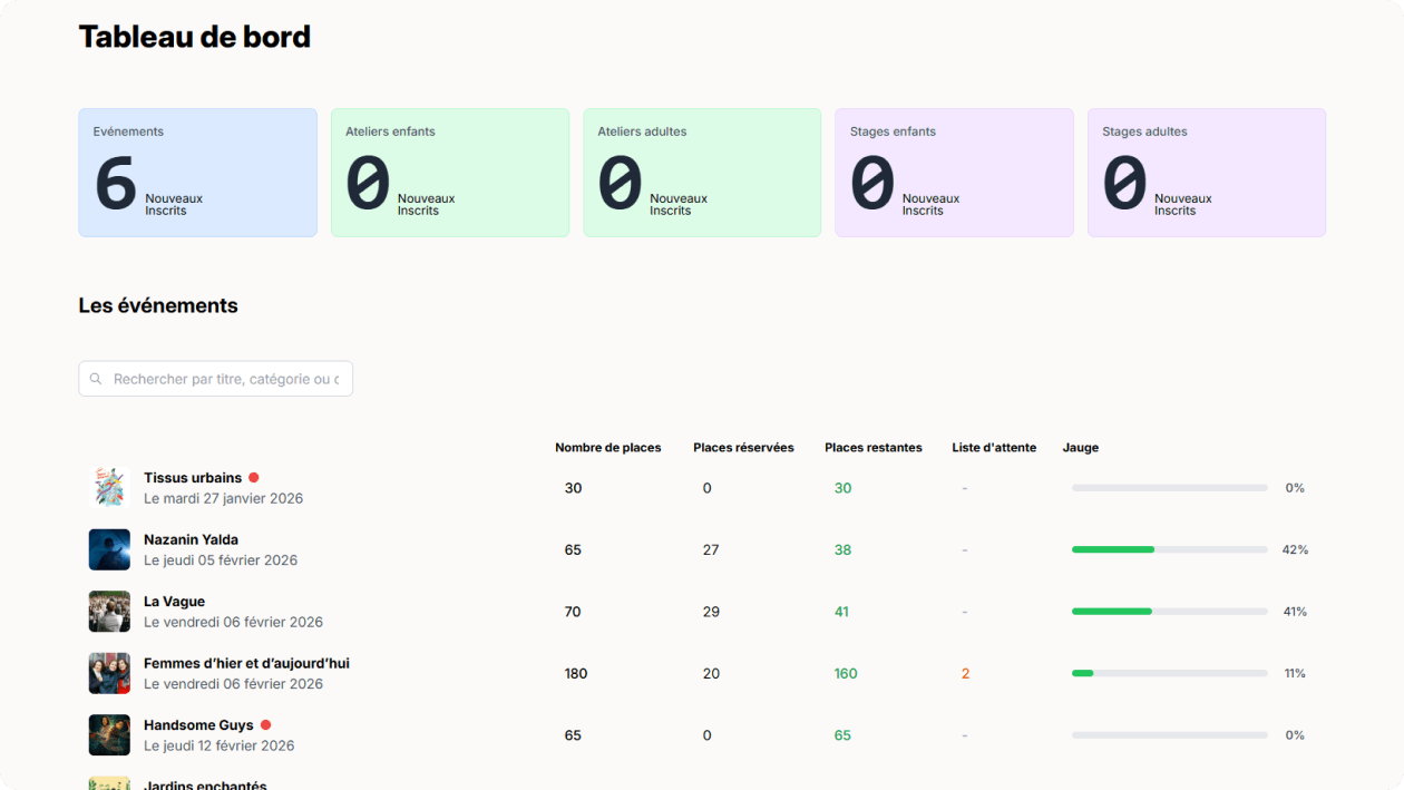 Suivez vos ventes, jauges et statistiques en temps réel. Visualisez le taux de remplissage de chaque événement et identifiez les tendances en un coup d'œil.