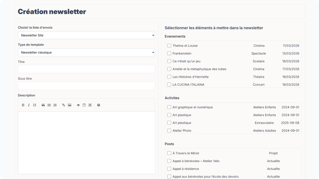 Vos newsletters se nourrissent directement des contenus de votre site. Plus besoin de tout recopier dans un outil externe. Événements, actualités et agenda synchronisés automatiquement.
